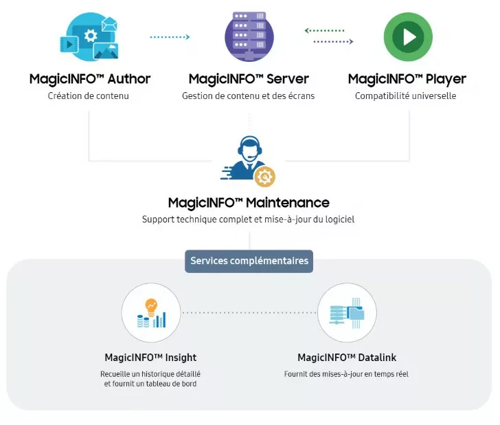 Magic Info (ou plus précisément MagicINFO™) est la suite logicielle de gestion d’affichage dynamique développée par Samsung Electronics. Cette plateforme permet de créer du contenu, de le planifier, de le distribuer et de surveiller l’ensemble des écrans commerciaux depuis un point de contrôle centralisé. Elle fonctionne aussi bien sur un seul écran qu’avec un réseau de plusieurs milliers d’afficheurs répartis sur plusieurs continents.